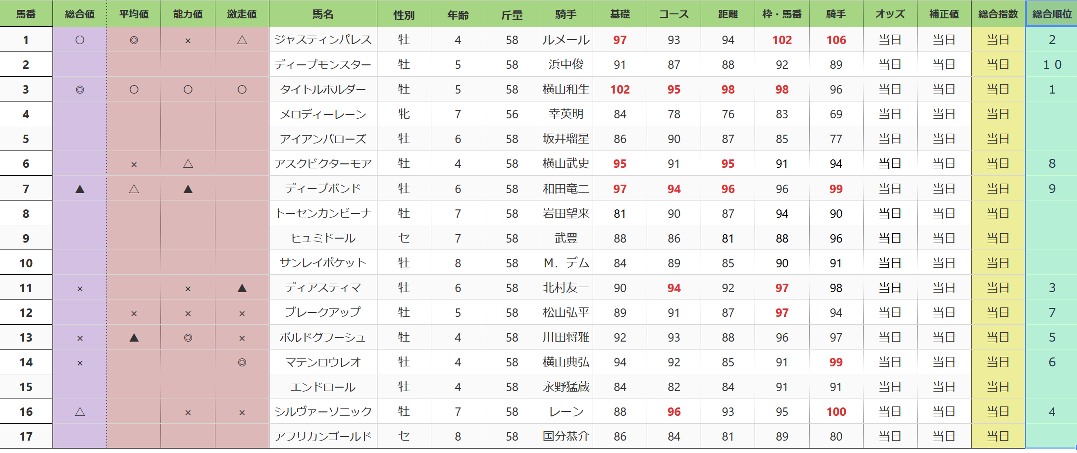 ●補正値 主に当日、馬場状態、過去のレースで不利など、修正点を上記の各指数を再チェックし、±指数を追加。