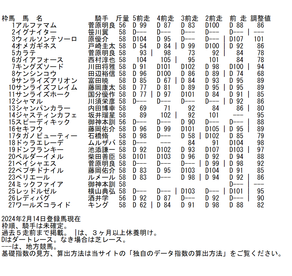 フェブラリーステークス(GI) 総合指数表(枠確定前)
