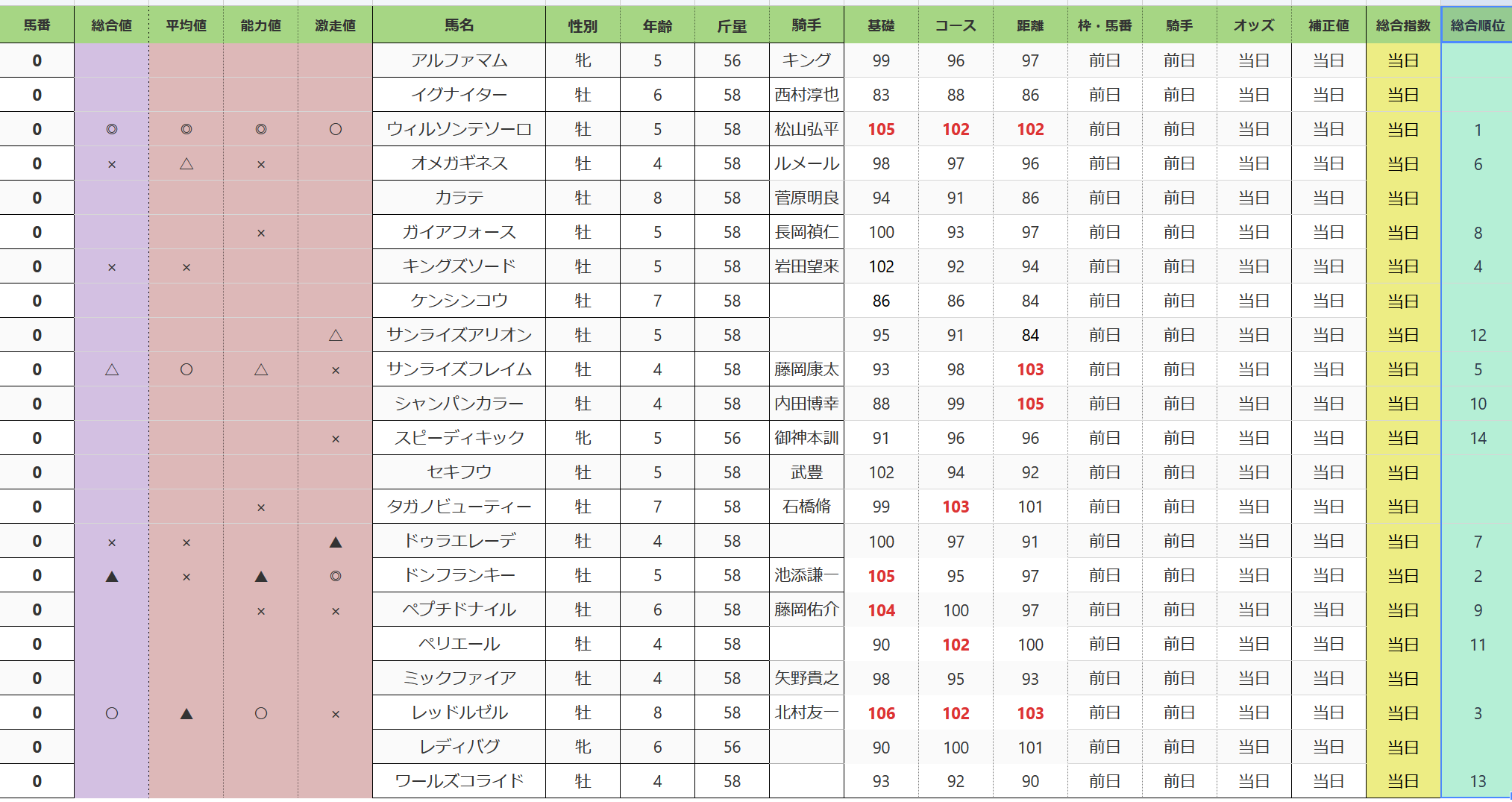 出走表の馬は参考で、騎手も、未確定で参考です。